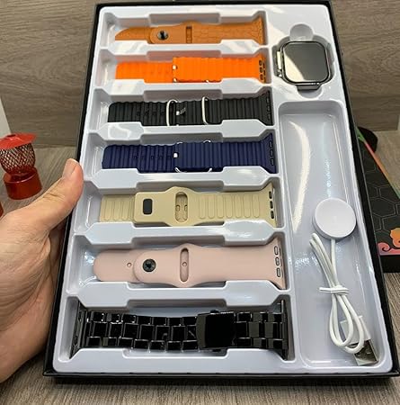 Elevate your smartwatch experience with this premium 7-in-1 Ultra3 watch strap set. The package includes seven distinctive straps in various colours and materials, offering versatile styling options for every occasion. The set features comfortable and durable straps in black, beige, orange, navy blue, and more, including a sophisticated metallic option. Each strap is precisely engineered to fit seamlessly with your smartwatch, featuring a 2.01-inch Infinite AMOLED HD display that delivers crystal-clear visuals. The watch supports Bluetooth calling functionality and includes comprehensive sports modes for fitness enthusiasts. The thoughtfully designed straps are easy to interchange, allowing you to match your watch with different outfits or activities. Perfect for both men and women, these free-size straps adapt to different wrist sizes. The complete set comes in an elegant box with a wireless charger, making it a comprehensive smartwatch accessory solution.