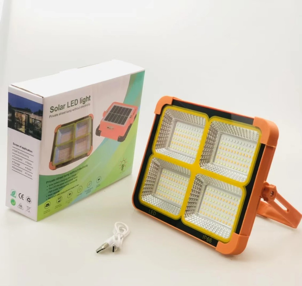 Solar LED Light, IP66 Waterproof, Portable Floodlight with Solar Panel, Orange and Black, 4 Panel Design, Outdoor Street Lamp